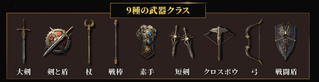 この世界では、キャラクターの成長は特定の「職業(クラス)」に縛られることなく、プレイヤーが選択する10種類の「武器」がその基盤となります。※日本ではどうやら最初は9のようですな。