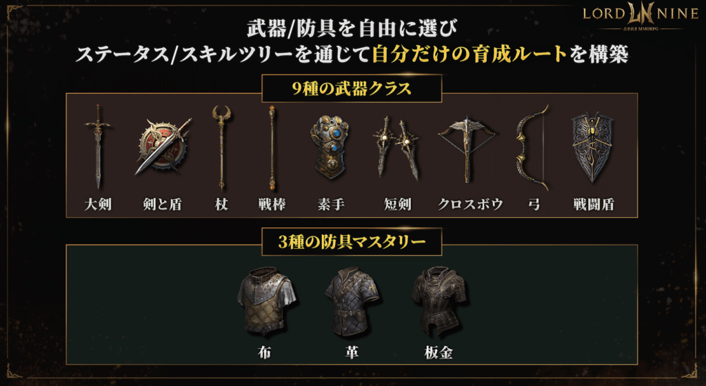 ・武器マスタリー:素手を含む9種類が存在し、それぞれが固有のスキルツリーと戦闘特性を持ちます。マスタリーレベルが上昇することで能力値が向上し、特定のレベルに達すると新たなスキルを習得できます。