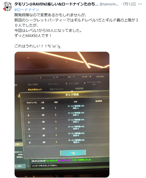 前回のシークレットパーティーではギルドレベル1の上限が30人であったのに対し、今回は「レベル1から50人になってました。ずっとMAX50人です!」とのこと。