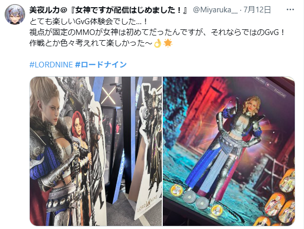 「美夜ルカ」氏は、「とても楽しいGvG体験会でした…!」「視点が固定のMMOが女神は初めてだったんですが、それならではのGvG!作戦とか色々考えれて楽しかった〜」と、クォータービュー固定という本作の視点だからこそ味わえるGvGの面白さ、戦略的な奥深さを高く評価しています。